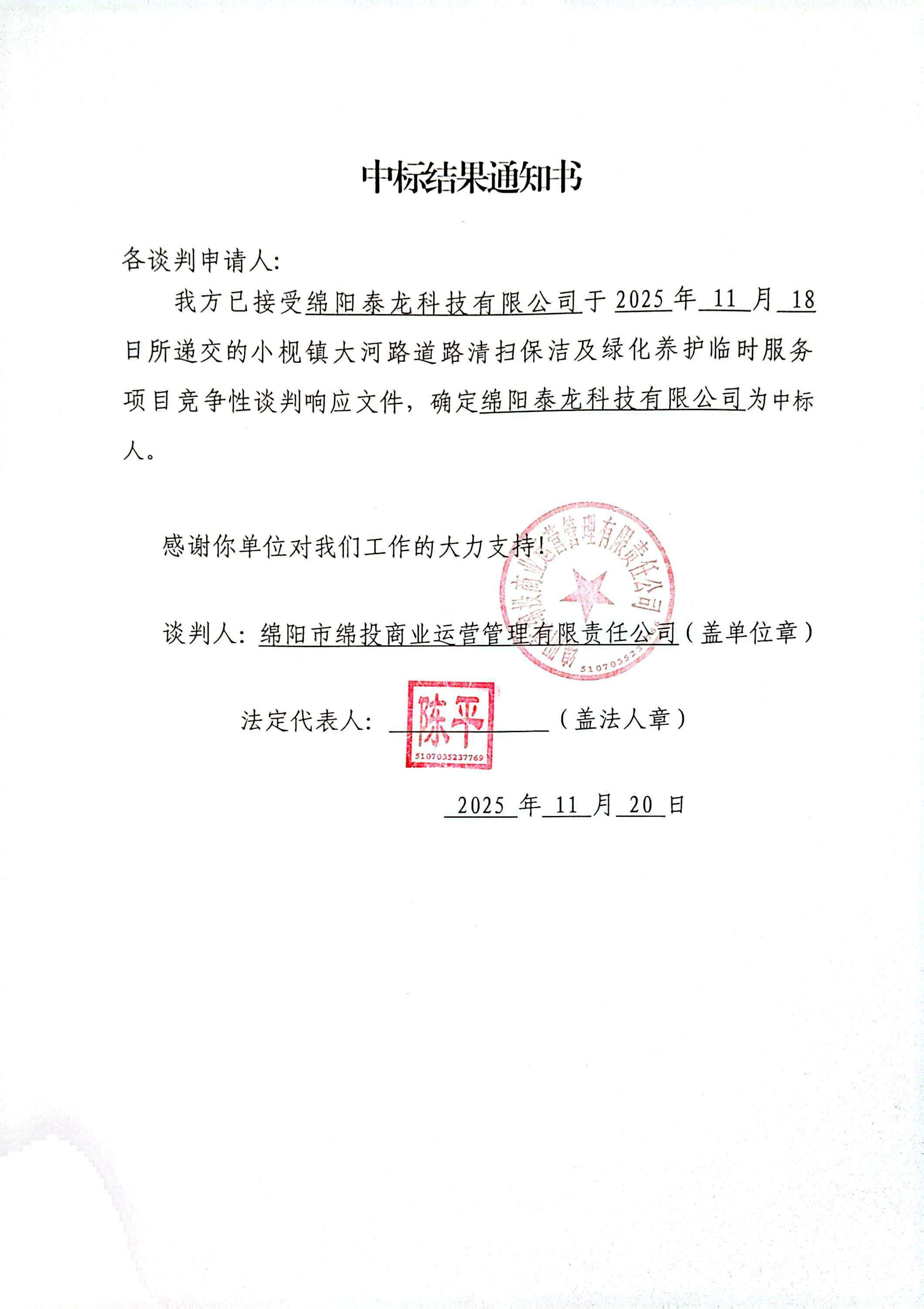 已接受绵阳泰龙科技有限公司2025 11  18 递交的小枧镇大河路蹊径清扫保洁及绿化养护暂时效劳项目竞争性谈判响应文件,,,,,, ,确定绵阳泰龙科技有限公司中标人。。。。。。。。