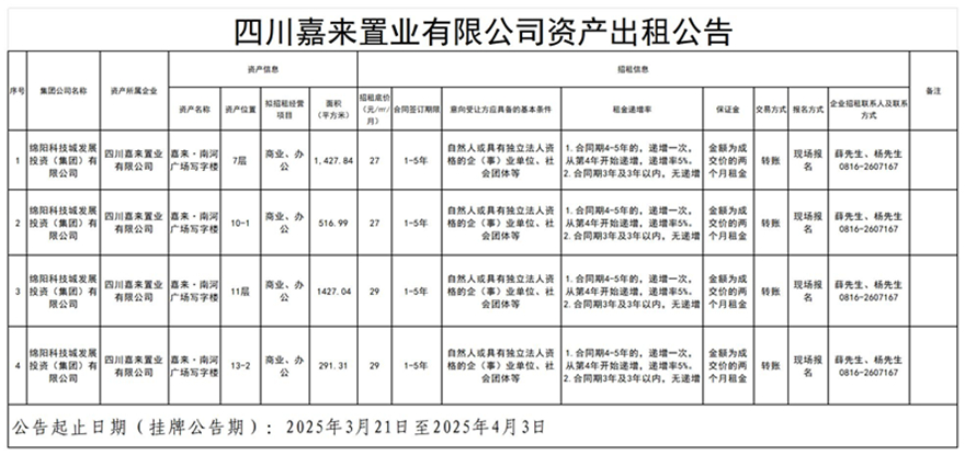 四川嘉来置业有限公司资产出租通告