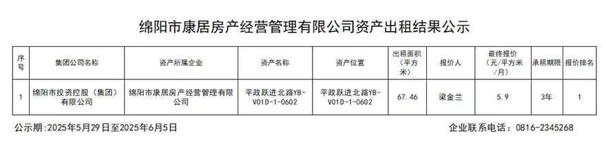 绵阳市康居房产谋划治理有限公司资产出租效果公示