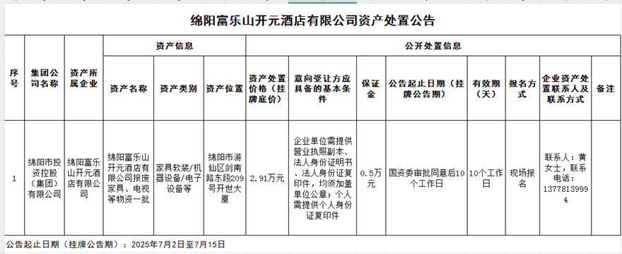 绵阳富乐山开元旅馆有限公司资产处置惩罚通告