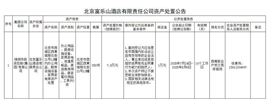 北京富乐山旅馆有限责任公司资产处置惩罚通告