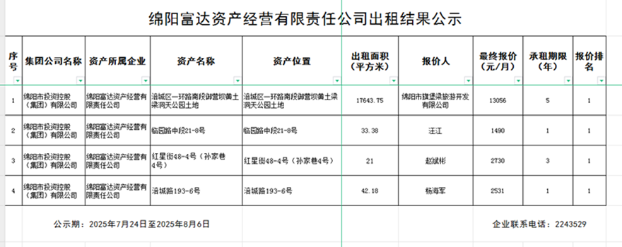 绵阳富达资产谋划有限责任公司出租效果公示