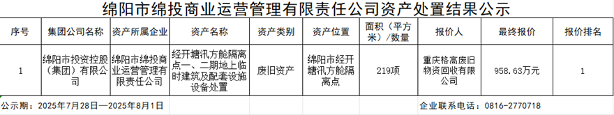 绵阳市BB电子·(china)有限公司官网商业运营治理有限责任公司资产处置惩罚效果公示