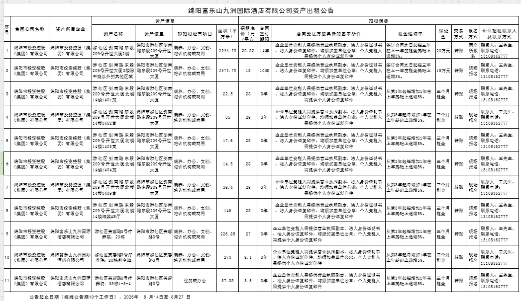 绵阳富乐山九洲国际旅馆有限公司资产出租通告
