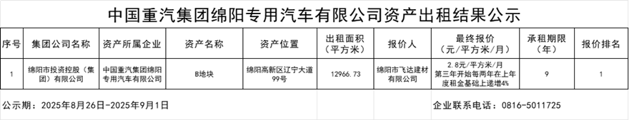 中国重汽集团绵阳专用汽车有限公司资产出租效果公示