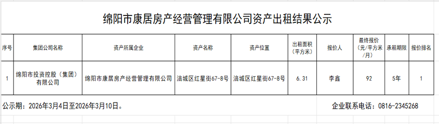 绵阳市康居房产谋划治理有限公司资产出租效果公示