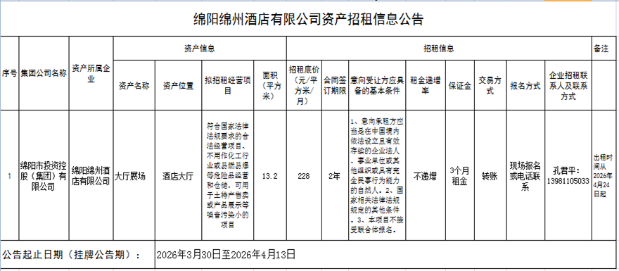 绵阳绵州旅馆有限公司资产招租信息通告