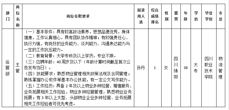 凭证绵阳市康来物业效劳有限公司宣布的招聘通告及招聘相关划定,,,,,,,经笔试、面试、配景视察等程序,,,,,,,拟任命孙丹同志到绵阳市康来物业效劳有限公司运营部事情,,,,,,,现予以公示,,,,,,,详细情形如下: