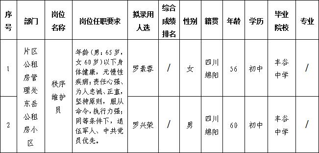 凭证康居公司宣布的恒久招聘一线勤杂职员的招聘通告相关划定,,,,,,经面试、体检等程序,,,,,,拟任命罗素蓉、罗兴荣同志到绵阳市康居房产谋划治理有限公司片区公租房治理处东岳公租房小区事情,,,,,,现予以公示,,,,,,详细情形如下: