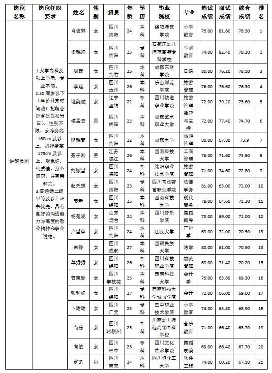 凭证四川越王楼文化撒播有限公司宣布的招聘通告及招聘相关划定,,,,,,,经笔试、面试等程序,,,,,,,现将笔试(面试)效果予以公示。。。。。。