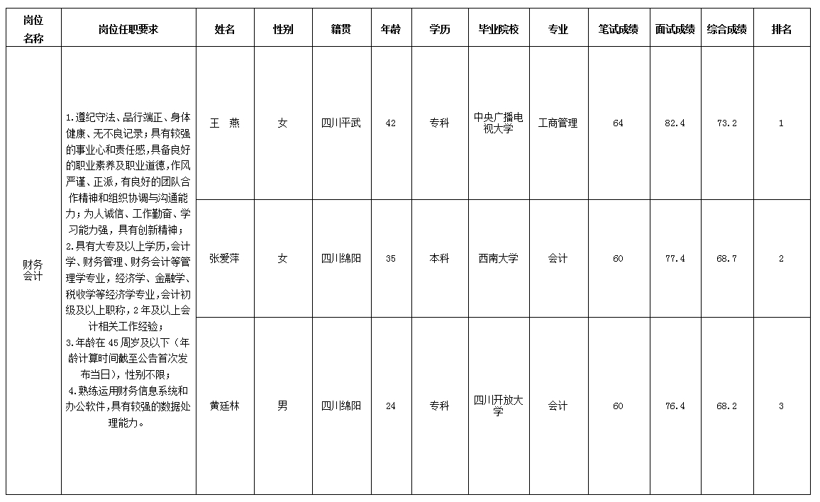 凭证绵阳市绵州嘉来会务效劳有限公司宣布的招聘通告及招聘相关划定,,,,,,,,经笔试、面试等程序,,,,,,,,现将笔试(面试)效果予以公示。。。。。。。。