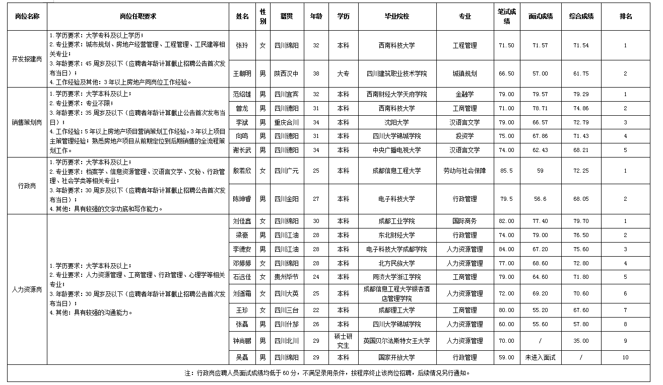 凭证绵阳市BB电子·(china)有限公司官网置地有限公司宣布的招聘通告及招聘相关划定,,,,,经笔试、面试等程序,,,,,现将笔试、面试效果予以公示。。。。。
