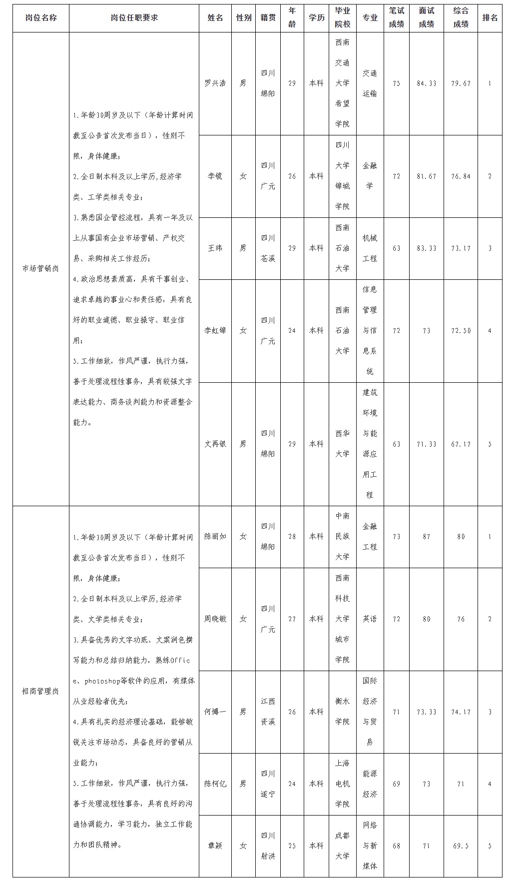 凭证绵阳市BB电子·(china)有限公司官网商业运营治理有限责任公司宣布的招聘通告及招聘相关划定,,,,,,,,经笔试、面试等程序,,,,,,,,现将笔试、面试效果予以公示。。。。。。。