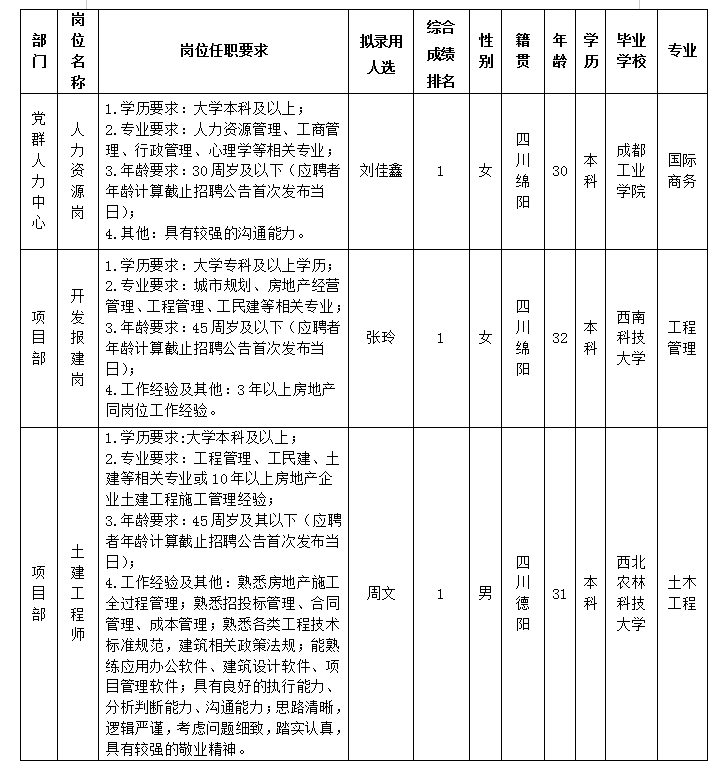 凭证绵阳市BB电子·(china)有限公司官网置地有限公司宣布的招聘通告及招聘相关划定,,,,,,,经笔试、面试、考察、体检等程序,,,,,,,拟任命刘佳鑫等3名同志到绵阳市BB电子·(china)有限公司官网置地有限公司事情,,,,,,,现予以公示,,,,,,,详细情形如下: