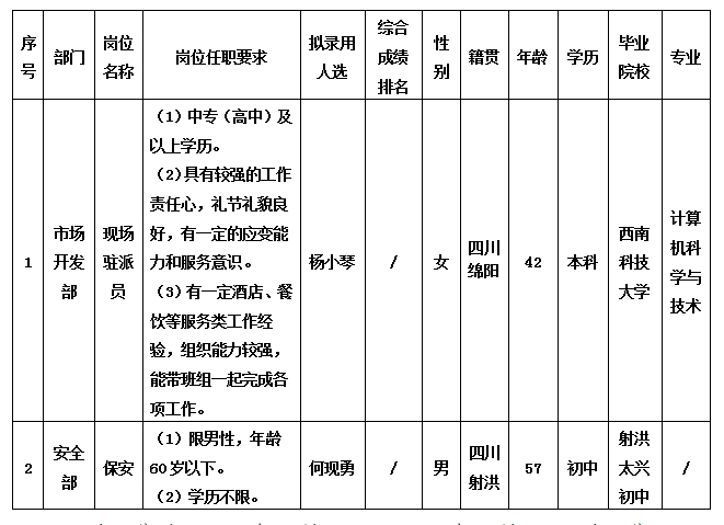 凭证绵阳绵州旅馆有限公司宣布的招聘通告及招聘相关划定,,,,,,,,经面试、体检等程序,,,,,,,,拟任命杨小琴等同志到我司事情,,,,,,,,现予以公示,,,,,,,,详细情形如下: