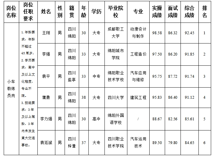 【果真招聘】绵阳市汽车实验驾驶手艺学校股份有限公司关于招聘小车教练员岗位测试效果的公示