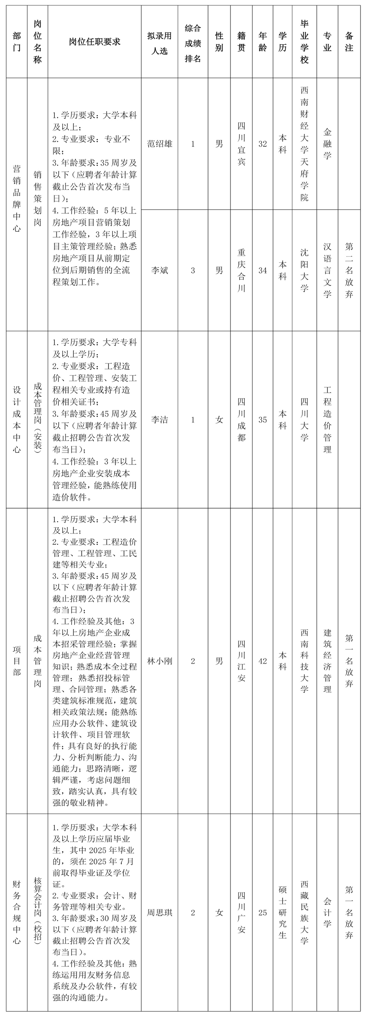 【果真招聘】绵阳市BB电子·(china)有限公司官网置地有限公司关于销售策划岗等岗位拟任命人选的公示