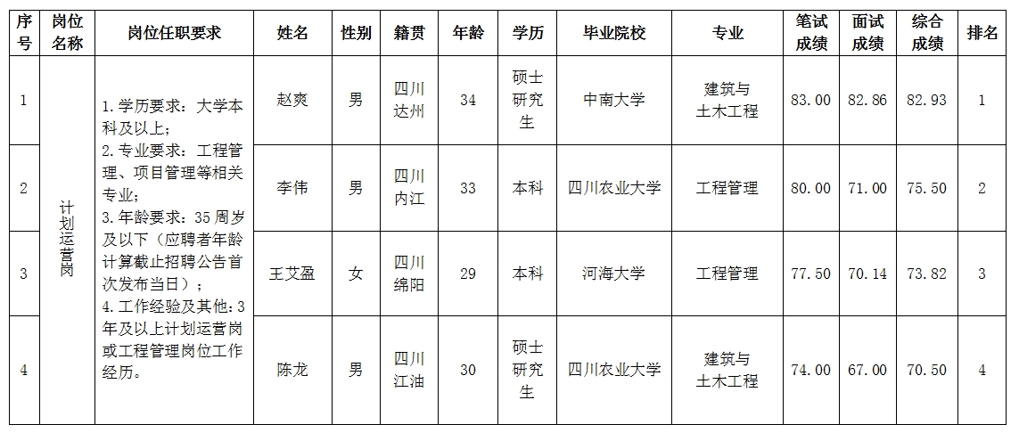 凭证绵阳市BB电子·(china)有限公司官网置地有限公司宣布的招聘通告及招聘相关划定,,,,,,经笔试、面试等程序,,,,,,现将笔试、面试效果予以公示。。。。。。。