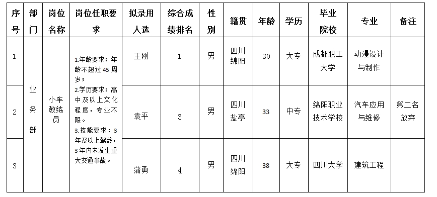 凭证绵阳市汽车实验驾驶手艺学校股份有限公司宣布的招聘通告及招聘相关划定,,,,,,,经实操、面试、考察、体检等程序,,,,,,,拟任命王刚等3位同志到绵阳市汽车实验驾驶手艺学校股份有限公司事情,,,,,,,现予以公示,,,,,,,详细情形如下: