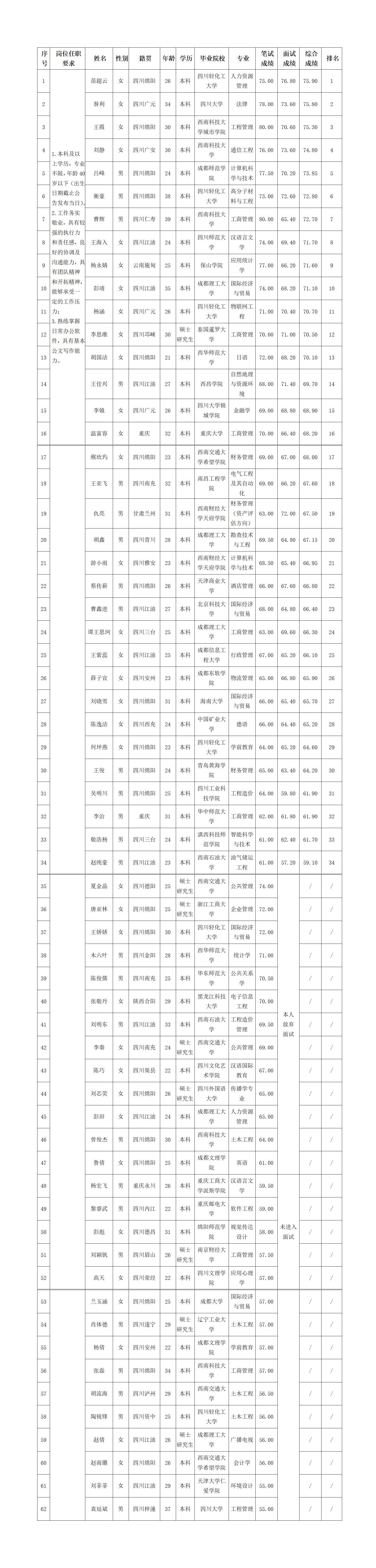 凭证四川绵江能源有限公司宣布的招聘通告及招聘相关划定,,,,,,,经笔试、面试等程序,,,,,,,现将笔试、面试效果予以公示。。。 。 。。。。