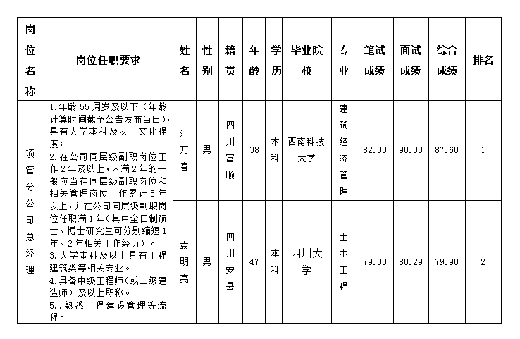 凭证四川嘉来修建工程有限公司宣布的延伸项目治理分公司总司理岗位报名时间的通告及相关划定 ,,,,,经笔试、面试等程序 ,,,,,现将综合效果予以公示。。。。。。。