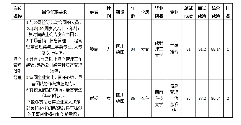 【内部选聘】绵阳市BB电子·(china)有限公司官网商业运营治理有限责任公司关于资产治理部副司理岗位内部竞聘测试效果的公示