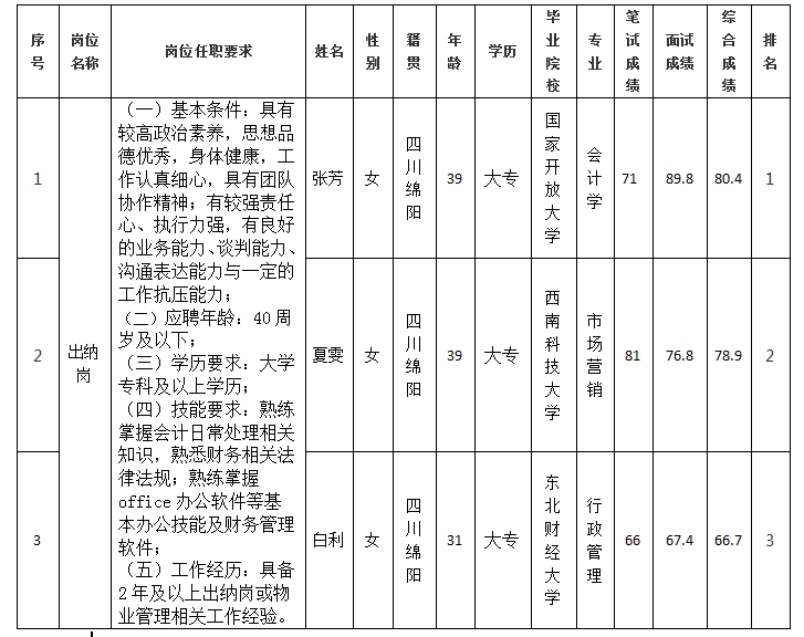 凭证绵阳市康来物业效劳有限公司宣布的选聘通告及选聘相关划定,,,,,经笔试、面试等程序,,,,,现将笔试(面试)效果予以公示。。。。。。。。