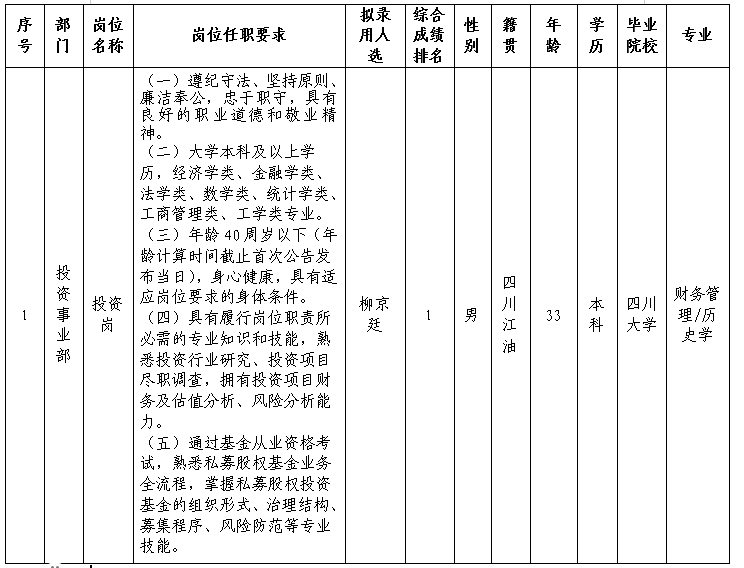 凭证绵阳BB电子·(china)有限公司官网私募基金治理有限公司宣布的招聘通告及招聘相关划定,,,,,,经笔试、面试、背调等程序,,,,,,拟任命柳京廷同志到绵阳BB电子·(china)有限公司官网私募基金治理有限公司事情,,,,,,现予以公示,,,,,,详细情形如下: