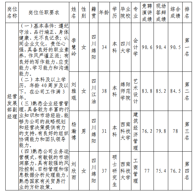 凭证四川西津物有限责任公司宣布的招聘通告及招聘相关划定,,,,,,经竞聘演讲、现场答辩等程序,,,,,,现将竞聘效果予以公示。。。。。。。