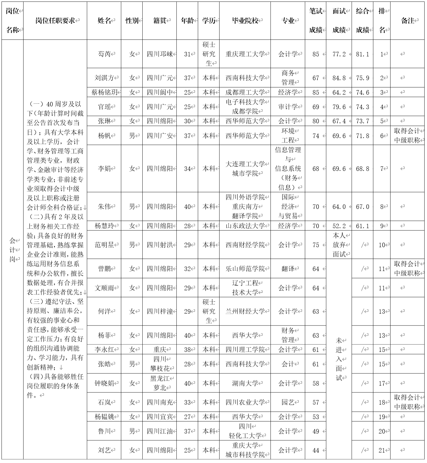 【果真招聘】绵阳金控投资治理有限责任公司 关于招聘会计岗测试效果的公示