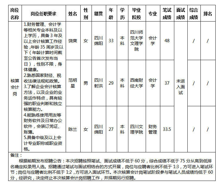 凭证四川西津物流有限责任公司宣布的招聘通告及招聘相关划定,,,,,经笔试,,,,,现将笔试效果予以公示。。。。。。
