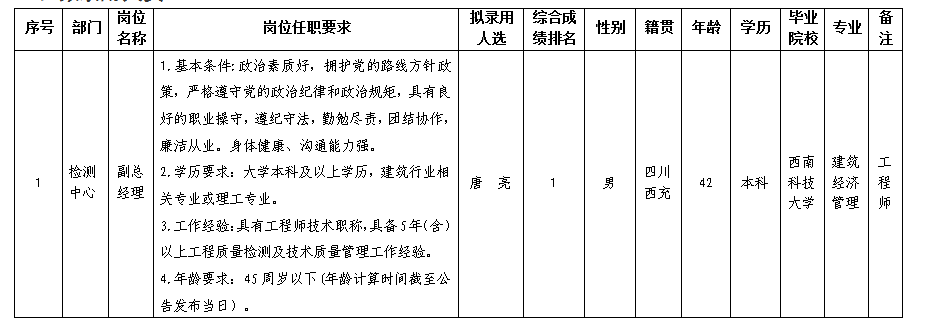 凭证绵阳富达资产谋划有限责任公司宣布的招聘通告及招聘相关划定,,,, ,,经测试考察、体检等程序,,,, ,,拟任命唐亮同志到绵阳市建设工程质量检测中心有限责任公司工作,,,, ,,现予以公示,,,, ,,详细情形如下: