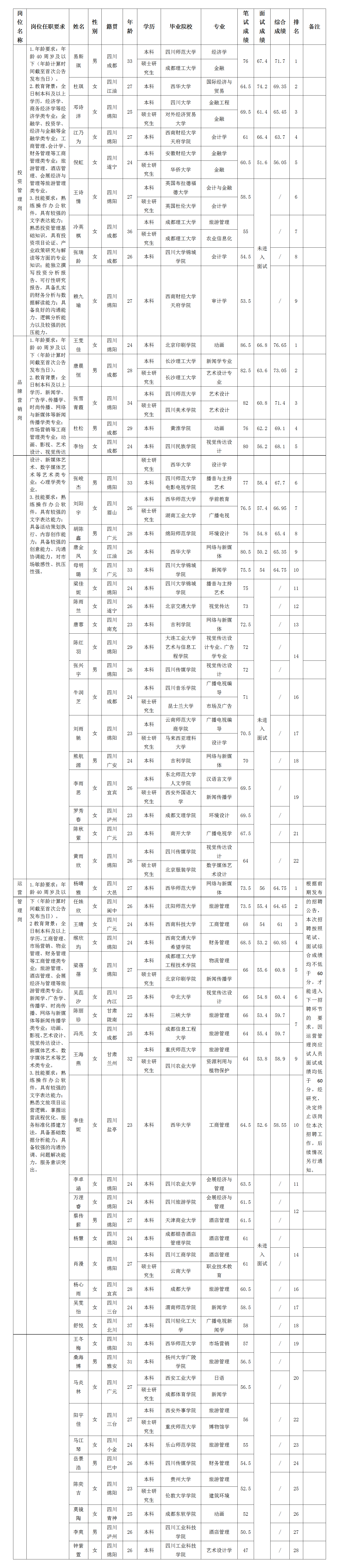 凭证绵阳文化旅游生长投资集团有限公司宣布的招聘通告及招聘相关划定,,,,,,,,经笔试、面试等程序,,,,,,,,现将笔试(面试)效果予以公示。。。。。。。
