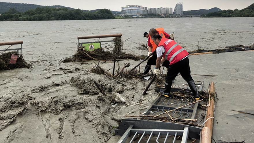 时间回溯到2018年“7.11”洪灾,,,,,,,洪峰过境导致三江半岛商铺被淹,,,,,,,亲水廊桥被树干等漂浮物硬生生扯毁。。 。。。 。作为治理方,,,,,,,越王楼公司深感责任重大,,,,,,,下刻意彻底刷新,,,,,,,防汛预案自此一连升级迭代。。 。。。 。