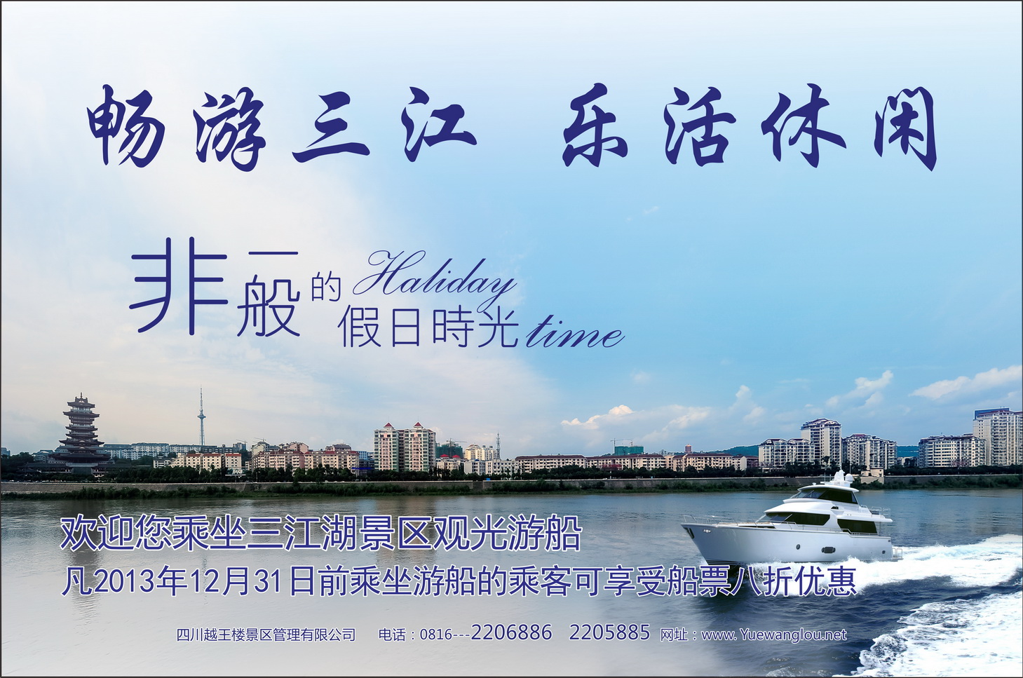 ??? 三江湖游船已于2013年8月30日完成首航,,,,,,,,并正式对外开放谋划,,,,,,,,为使宽大市民和游客更好地明确三江景物、感受三江文化,,,,,,,,凡2013年12月31日前乘坐游船的旅客均可享受船票8折优惠。。。。。