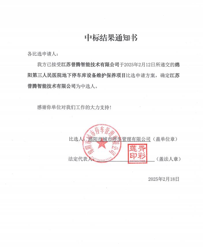 绵阳第三人民医院地下停车库装备维护保养项目中标效果通知书