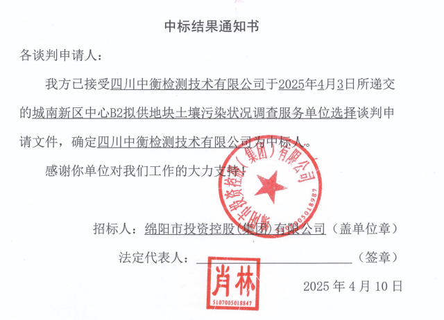城南新区中心B2拟供地块土壤污染状态视察效劳单位选择中标效果通知书