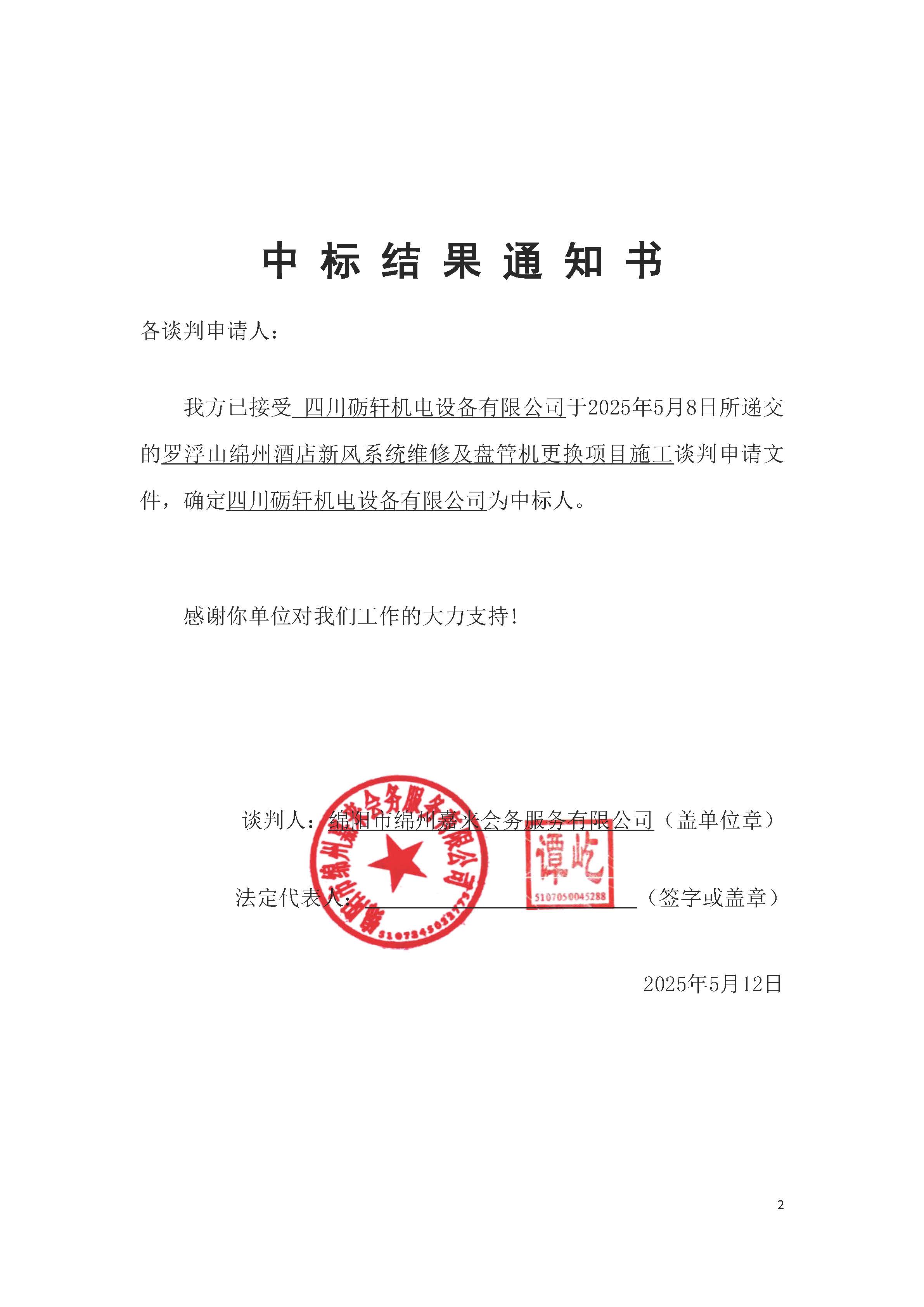 罗浮山绵州旅馆新风系统维修及盘管机替换项目施工中标效果通知