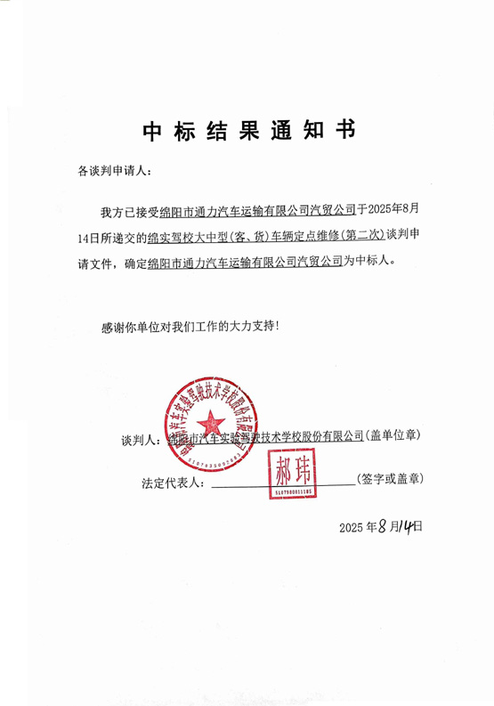 绵实驾校大中型(客、货)车辆定点维修(第二次)中标效果通知