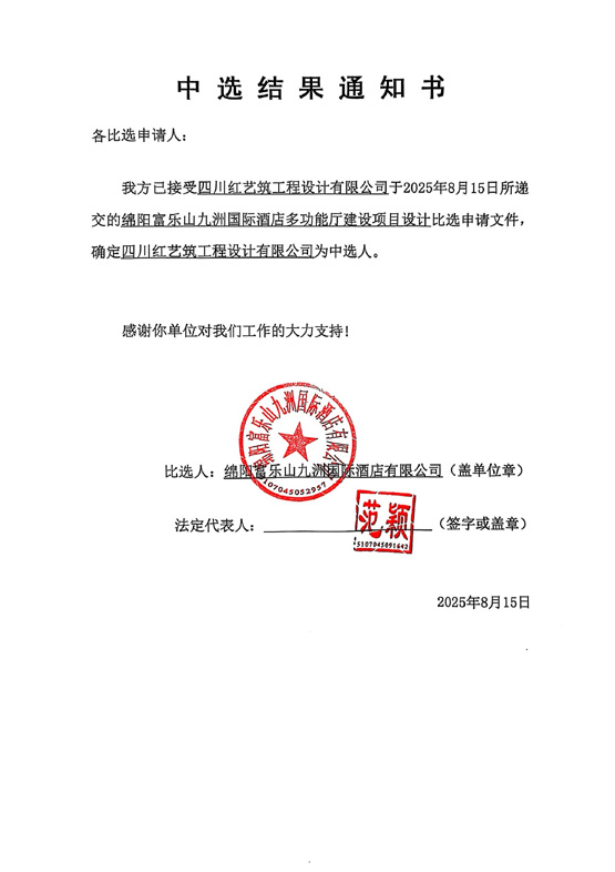 绵阳富乐山九洲国际旅馆多功效厅建设项目设计中选效果通知