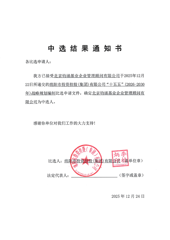 绵阳市投资控股(集团)有限公司“十五五”(2026-2030年)战略妄想体例中选效果通知