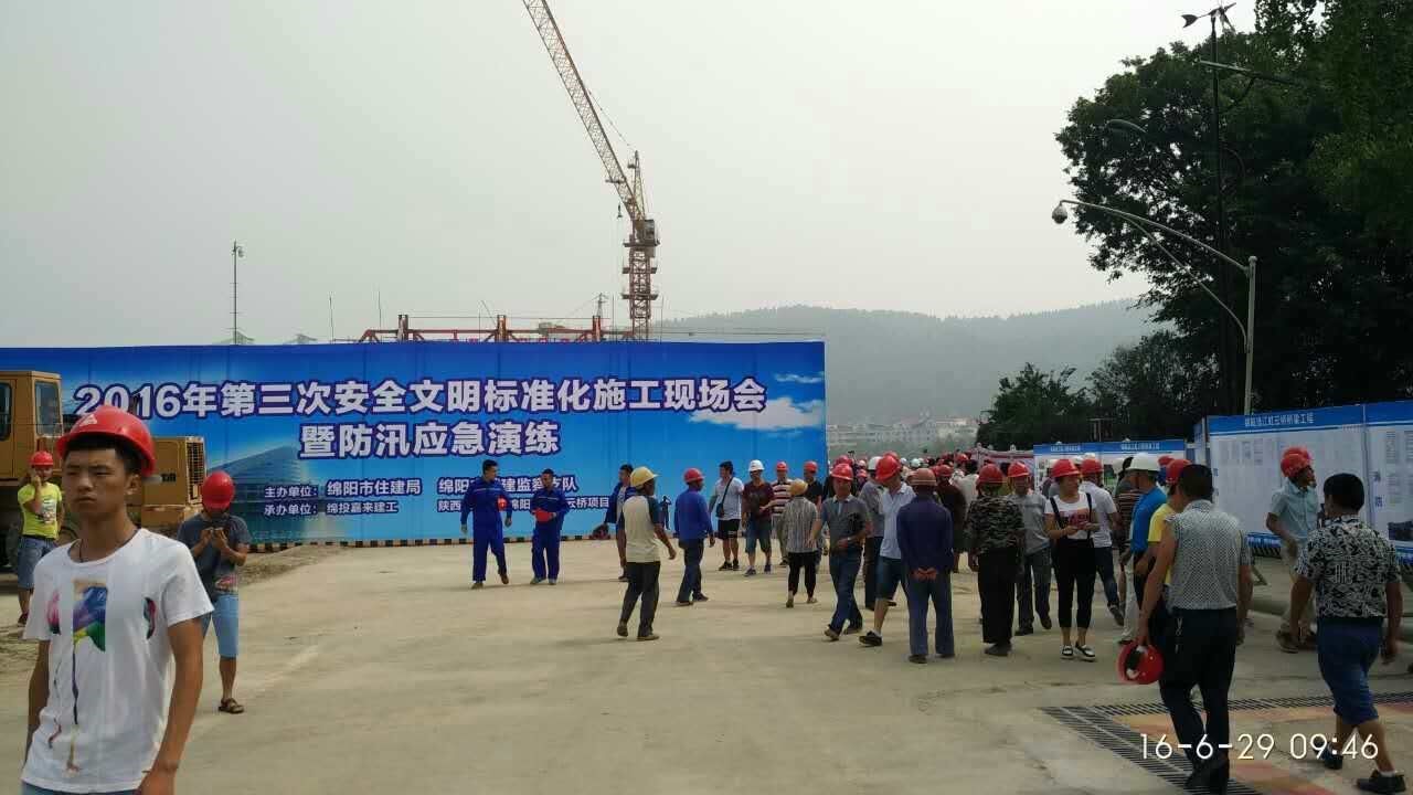 629日, ,,,,在虹云桥项目现场, ,,,,由市住建局和城建监察支队主理、嘉来建工和陕西三秦公司承办的2016年绵阳市第三次清静文明标准化施工现场会暨防汛应急演练运动准期举行。 。。。。。。。这是我市首次举行在建工程清静文明标准化施工现场观摩会暨防汛应急演练运动, ,,,,市住建局、城建监察支队、嘉来建工相关向导及来自全市各在建工地代表300余人加入现场观摩及演练。 。。。。。。。